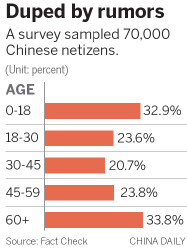 The platform listed 10 popular but false online rumors over the past year, finding that people over 60 years old had the highest chance of being tricked-as high as 33.8 percent.