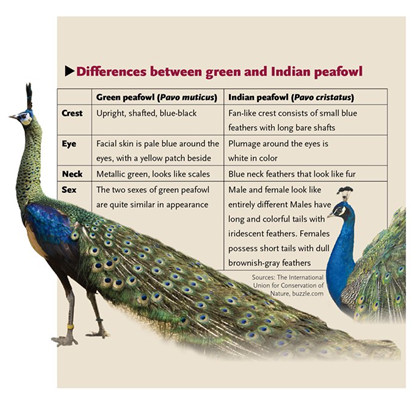 But now most peafowl on display in China are not the native green bird, but are instead blue Indian peafowl, a species native to that subcontinent. "No Chinese zoo has a pure green peafowl," Chinese Science News said in a recent report, quoting an employee of the Chinese Association of Zoological Gardens.