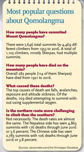 "Before, the number was only two or three a year. In 2009, non-governmental Qomolangma mountaineering started to thrive," he said. "More and more Chinese are interested in trekking high mountains."