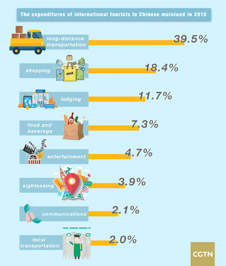 The consumption of foreign tourists is only one-fifth of Chinese tourists' spending abroad. While Chinese people spend more on shopping, around 40 percent of foreigners' expenditures were used on long-distance transportation.
