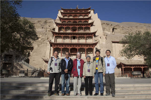 Mimi Gates (third from left) and Fan Jinshi (fourth from left), former head of the Dunhuang Research Academy. Gates has worked closely with the academy for years. (Photo by Ding Xiaosheng/For China Daily)