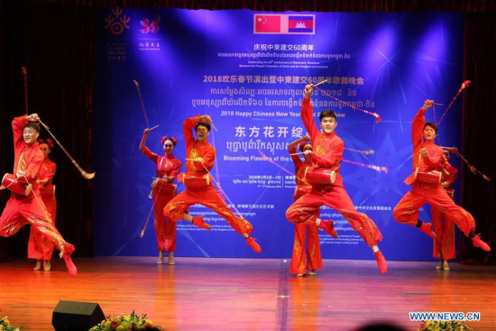 Chinese artists perform during a gala in Phnom Penh, Cambodia, on Feb. 2, 2018. Chinese and Cambodian artists jointly performed here Friday night to celebrate the upcoming Chinese Lunar New Year and the 60th anniversary of the establishment of the China-Cambodia diplomatic relations. (Xinhua/Sovannara)