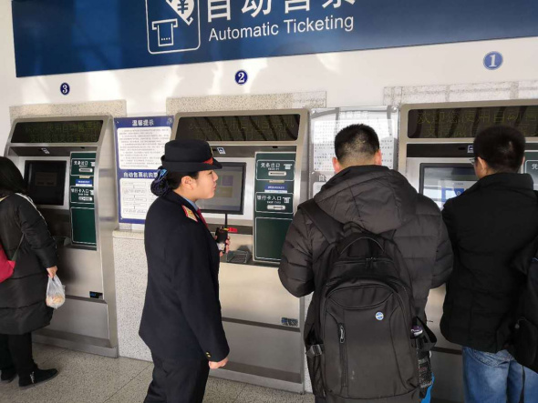 Workers at Baiyangdian Railway Station in Xiongan New Area help passengers on Feb 1.(Photo provided to chinadaily.com.cn)