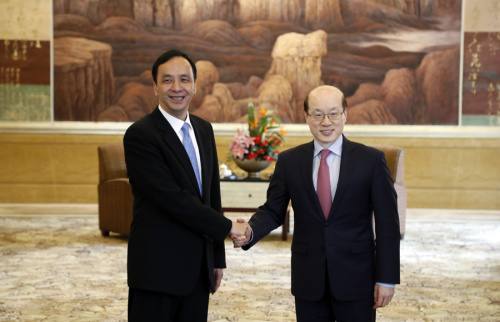 Liu Jieyi (right), head of the State Council Taiwan Affairs Office, meets with Eric Chu Li-lun, mayor of New Taipei City, after speaking with a delegation from Taiwan led by Chu on Monday in Shanghai. They discussed several issues. (Photo/Agencies)
