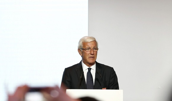 Marcello Lippi, manager of Chinese national team, delivers a speech on the opening ceremony of the "outstanding rising star" project in Beijing, May 7. (Photo/Xinhua)