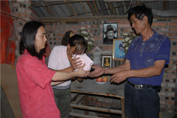 Parents of twin girls donating the ashes to Shu Yong, which the artist blended with clay to create flower sculptures. (Photo provided to China Daily)