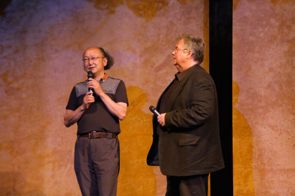Playwright Wei Jin (left) and composer Enjott Schneider share behind-the-scene stories at a news conference in Beijing on May 14, 2018. (Photo provided to chinadaily.com.cn)