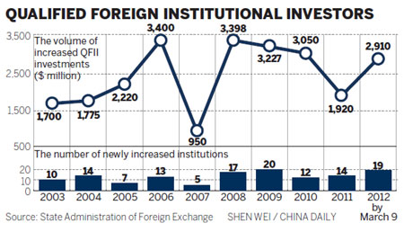 China's regulators approved QFII licenses for 19 new foreign investment institutions between Jan 1 and March 9, granting a record high $2.91 billion in quotas, according to the State Administration of Foreign Exchange.