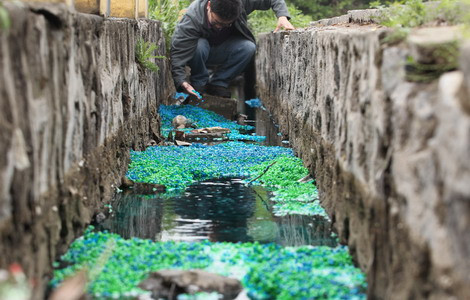 The capsules dyed the sewage water blue and formed a colorful layer stretching for more than 300 meters. The local drug bureau could not confirm whether the water and soil had been contaminated.