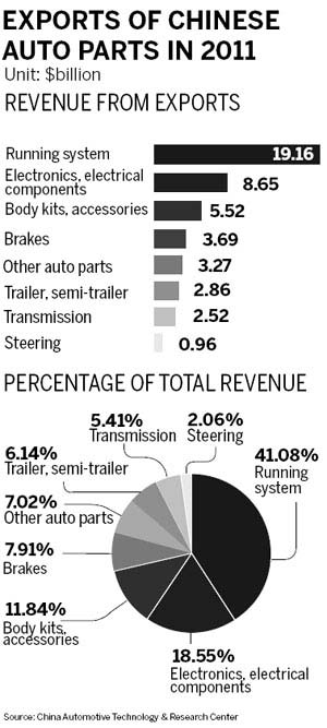 Last year, revenue from Chinese auto parts exports reached 46.63 billion yuan ($7.34 billion), a 27 percent increase from the previous year, according to the China Automotive Technology & Research Center. Because of the growth in exports from China, governments in Europe and the United States have imposed stringent regulations on China's exports of spare parts.