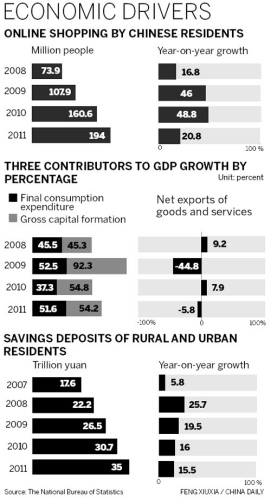 In recent years, the government has been improving the social welfare system and putting forward policies that stimulate domestic consumption, especially after the US sub-prime mortgage crisis, to expand domestic demand. According to the National Bureau of Statistics, the contribution of consumption to economic growth was 51.6 percent last year, up 14.8 percentage points compared with 2010.