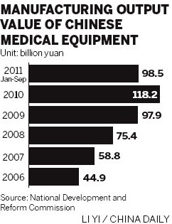 By the end of September 2011, the value of the Chinese medical equipment industry's production had been 98.54 billion yuan ($15.73 billion), up 26.6 percent year-on-year, according to Zero2IPO Research Center.