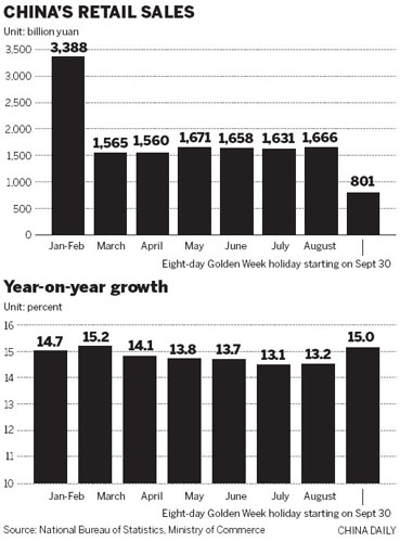 According to the Ministry of Commerce, from Sept 30 to Oct 7, the sales of key retail and catering enterprises under the State's monitoring totaled about 800 billion yuan ($127.2 billion), an increase of about 15 percent compared with last year's Golden Week.