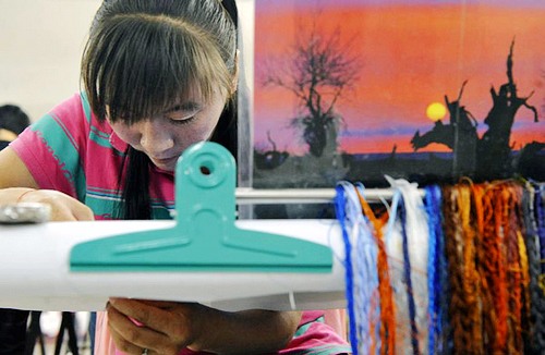 A Chinese worker hunches over a sewing machine, making made-in-China products. (Photo/Xinhua)