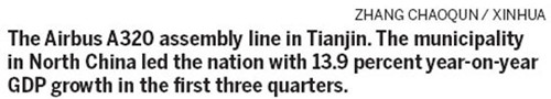 North China's Tianjin led the nation with 13.9 percent year-on-year GDP growth in the first three quarters, while Guangdong, the country's economic powerhouse, posted 7.9 percent year-on-year growth.