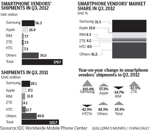 In the third quarter, ZTE shipped 7.5 million smartphones globally, ranking fourth with 4.2 percent of the global market, from 3.3 percent a year earlier, according to research company IDC.