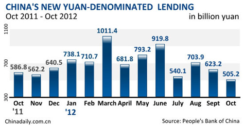 China's new yuan-denominated lending in October stood at 505.2 billion yuan (80.32 billion U.S. dollars), dropping 81.6 billion yuan from a year earlier, the People's Bank of China, the central bank, announced on Monday.