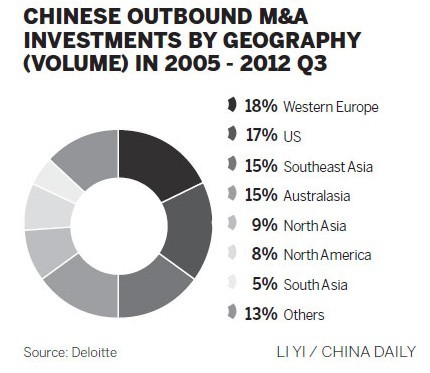 The first three quarters of this year saw Greater China outbound M&As' value reach $52.2 billion with 133 deals. Compared with the $44.9 billion investment of 145 transactions in the same period of 2011, the number of deals this year fell by 8.2 percent, while the value of outbound investments rose by 16.2 percent to its highest level since 2005, the report said.