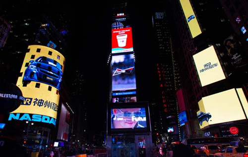 A promotional display of China Auto Rental Holdings Inc illuminates New York's Times Square as after it made its debut on Monday in celebration of the company's 5th anniversary. The 30-second advertisement, which features the name and the logo of the company, is organized by Nasdaq and will be played 90 times a day on the screen until December 15. [Yu Wei/China Daily]