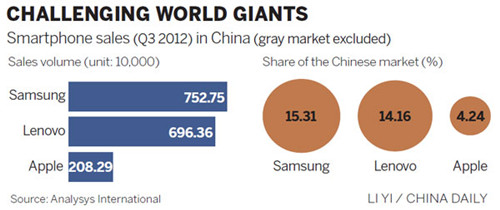 Compared with Apple, which launches one smartphone model annually on average, Lenovo introduced 46 smartphone models, covering all price ranges, to the Chinese market in 2012.