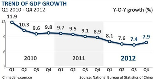 The growth rate, the slowest one since 1999, was down from 9.3 percent in 2011 and 10.4 percent in 2010.