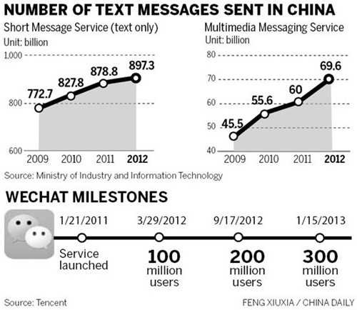 People sent 897.3 billion text messages via their mobile phones in China last year, according to figures from the Ministry of Industry and Information Technology. [Photo / China Daily]