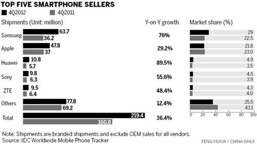 Chinese telecom giant Huawei Technologies Co Ltd emerged as the world's third-largest smartphone vendor in the fourth quarter of 2012, as traditional mobile phone manufacturers like Nokia Corp and HTC Corp tumbled.