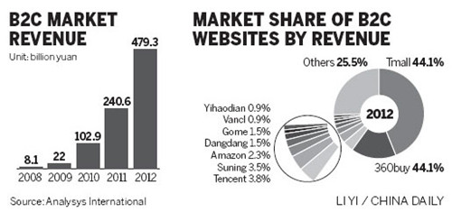 According to domestic research company Analysys International, Suning had a 3.5 percent share of the business-to-consumer market in 2012, trailing Tmall's 44.1 percent, 360buy's 16 percent and Tencent Holdings Ltd's 3.8 percent.
