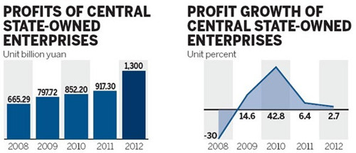 In 2012, total profits generated by central SOEs were 1.3 trillion yuan ($207 billion), a 52.5 percent surge from 2010 when Wang took the position.