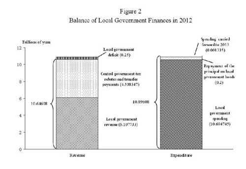 The revenue of local governments came to 6.107733 trillion yuan, an increase of 16.2%. Adding the 4.538347 trillion yuan in tax rebates and transfer payments from the central government, local government revenue totaled 10.64608 trillion yuan. Local government expenditure amounted to 10.694745 trillion yuan, up 15.3%. Adding the 200 billion yuan used to repay the principal on local government bonds and the 1.335 billion yuan carried forward to 2013, local government expenditure totaled 10.89608 trillion yuan. Total expenditure by local governments exceeded total revenue by 250 billion yuan.