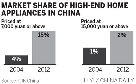 The market share of home appliances that cost 7,000 yuan and above was less than 5 percent in the entire household appliances market in 2004. However, the figure jumped to 15 percent in 2012, according to GfK China.