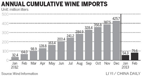 Among foreign suppliers, France continued to dominate China's wine market in 2012. From June 2011 to July 2012, China's imports of Bordeaux wine reached 63 million liters, industry data showed.