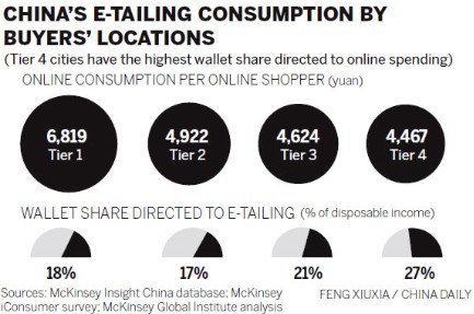 The annual spending of every online shopper averaged 6,819 yuan ($1,098) in first-tier cities, accounting for 18 percent of the person's total disposable income, according to a report by McKinsey Global Institute. [Photo/Provided to China Daily]