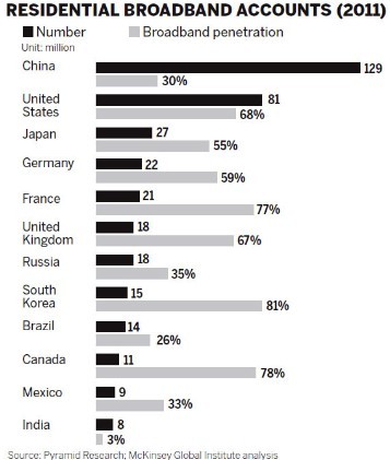 China has the world's largest online population, with 129 million residential broadband accounts, dwarfing the 81 million accounts in the United States in 2011. But broadband penetration remains at only 30 percent, indicating enormous room for further growth in the e-tailing market.