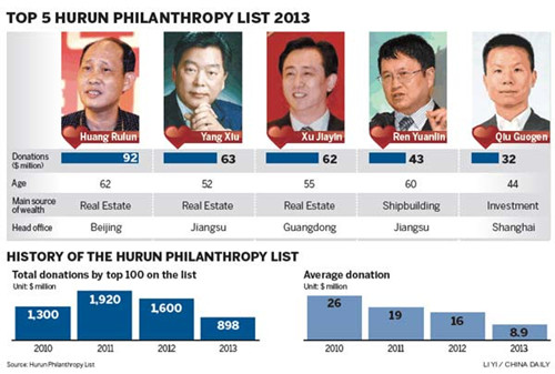 The latest Hurun Philanthropy List 2013 — from the Shanghai-based Hurun Report, which documents wealth in China — measured cash or cash-equivalent donations from April 1, 2012 to March 31, 2013.
