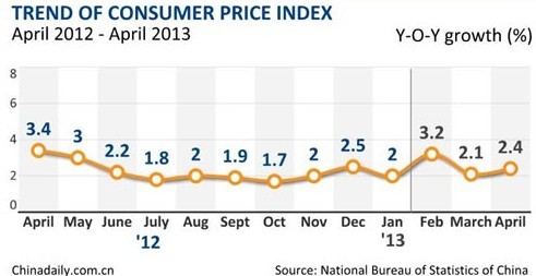 China's consumer price index (CPI), a main gauge of inflation, grew 2.4 percent year on year in April, up from 2.1 percent in March, the National Bureau of Statistics (NBS) said Thursday.