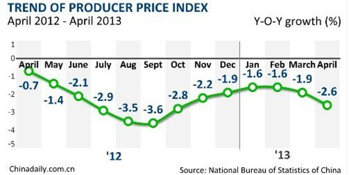 China's producer price index (PPI), which measures wholesale inflation, fell 2.6 percent year on year in April, the National Bureau of Statistics said on Thursday.