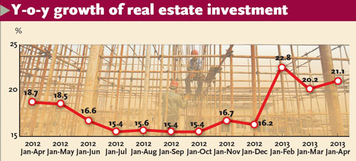 Real estate investment rose by 21.1 percent in the first four months of 2013 compared to the same period last year, up 0.9 percentage points from the first three months, the National Bureau of Statistics (NBS) said.