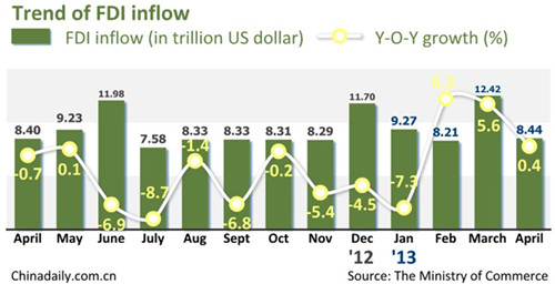 The first four months of the year saw FDI increase 1.21 percent year-on-year to $38.34 billion, while total FDI into the country in 2012 declined 3.7 percent from a year earlier to $111.72 billion.