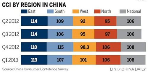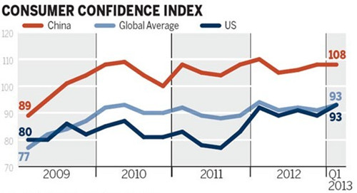 The latest Nielsen Global Survey of Consumer Confidence and Spending Intentions showed the Chinese consumer confidence index stood at 108 in the first quarter of 2013, unchanged from the previous quarter and 15 percentage points higher than the global average.