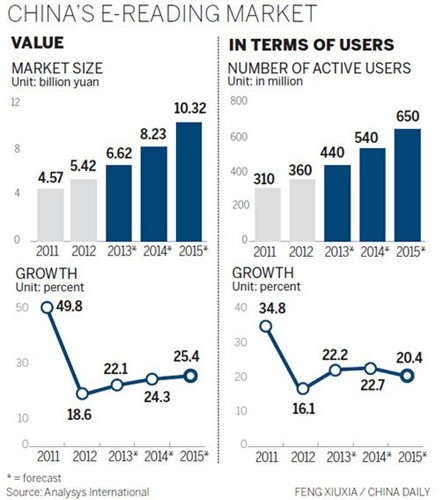 China's e-book market is expected to reach 8.23 billion yuan ($1.34 billion) in 2014, up 52 percent from 5.42 billion yuan in 2012, according to an estimate from Analysys International, a Beijing-based IT consultancy.