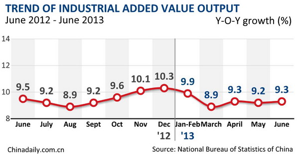 China's industrial value-added output rose 9.3 percent year on year in the first half of 2013, the National Bureau of Statistics (NBS) announced on Monday.