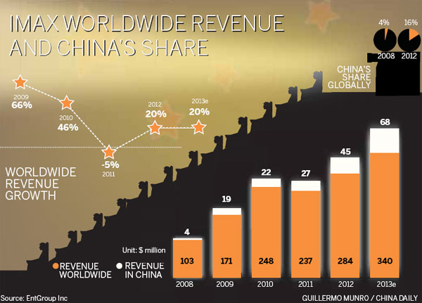 China's share of IMAX's global revenue jumped from 4 percent in 2008 to 16 percent in 2012, making it the fastest-growing market for IMAX across the globe.