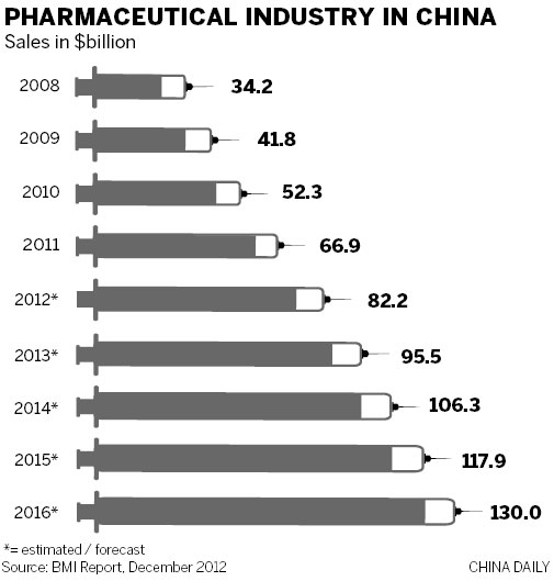 Statistics from international healthcare market research company IMS Health Inc show that China's pharmaceutical sales amounted to 600 billion yuan ($97.7 billion) last year, with average annual growth exceeding 20 percent over the last five years, compared with 0.3 percent in developed markets, such as the United States and Europe.