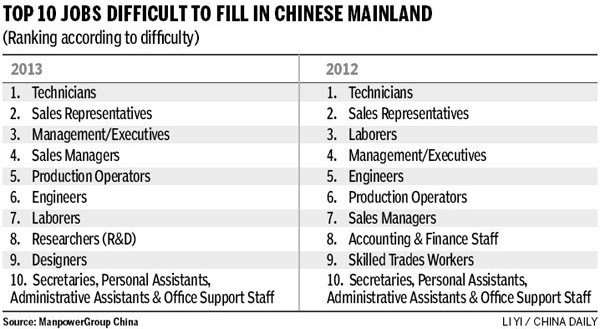 Technicians remain the hardest jobs to fill in the Chinese mainland for a second year, according to the results of the 2013 talent shortage survey released on Tuesday by ManpowerGroup.