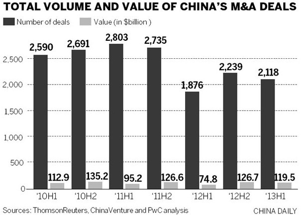 Amid tightening credit conditions and a slowing economy, first-half M&A deals in China declined 5 percent to 2,118, compared with the previous six months. In value terms, deals fell 6 percent to $119.5 billion.