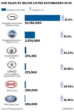 Meanwhile, Shanghai-listed companies Great Wall Motor Co Ltd, JAC Motors Co Ltd, Jinbei Auto Co Ltd, and Shenzhen-listed Zhongtong Bus Co Ltd and Ankai Bus Co Ltd all said that their net profit jumped by more than 50 percent in the first six months, as vehicle sales were driven by increasing demand.