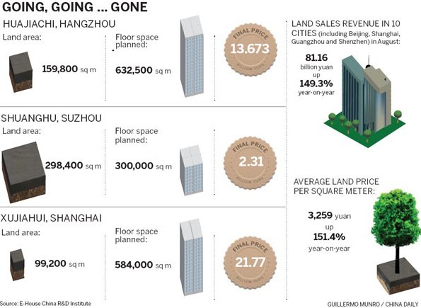 On the same day, Hangzhou in Zhejiang province recorded a new local land record when three mixed-use plots were sold for a record 13.67 billion yuan and Suzhou, Jiangsu province, saw a piece of commercial land sold to Shimao Property Holdings Ltd for a record 15,151 yuan per sq m of buildable area.