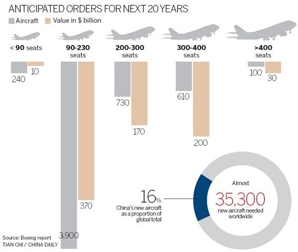 China's new aircraft market accounts for about 16 percent of the global total in terms of new deliveries and market value. More than 35,000 new commercial airplanes valued at $4.8 trillion are forecast to be delivered worldwide during the next 20 years, Boeing said.