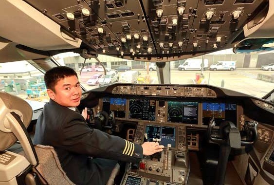 Captain Ji Ye of Boeing 787 looks back from the pilot seat of the Boeing 787, docked at the Heathrow Airport on Sept 10, 2013.[ Xie Songxin/China Daily]
